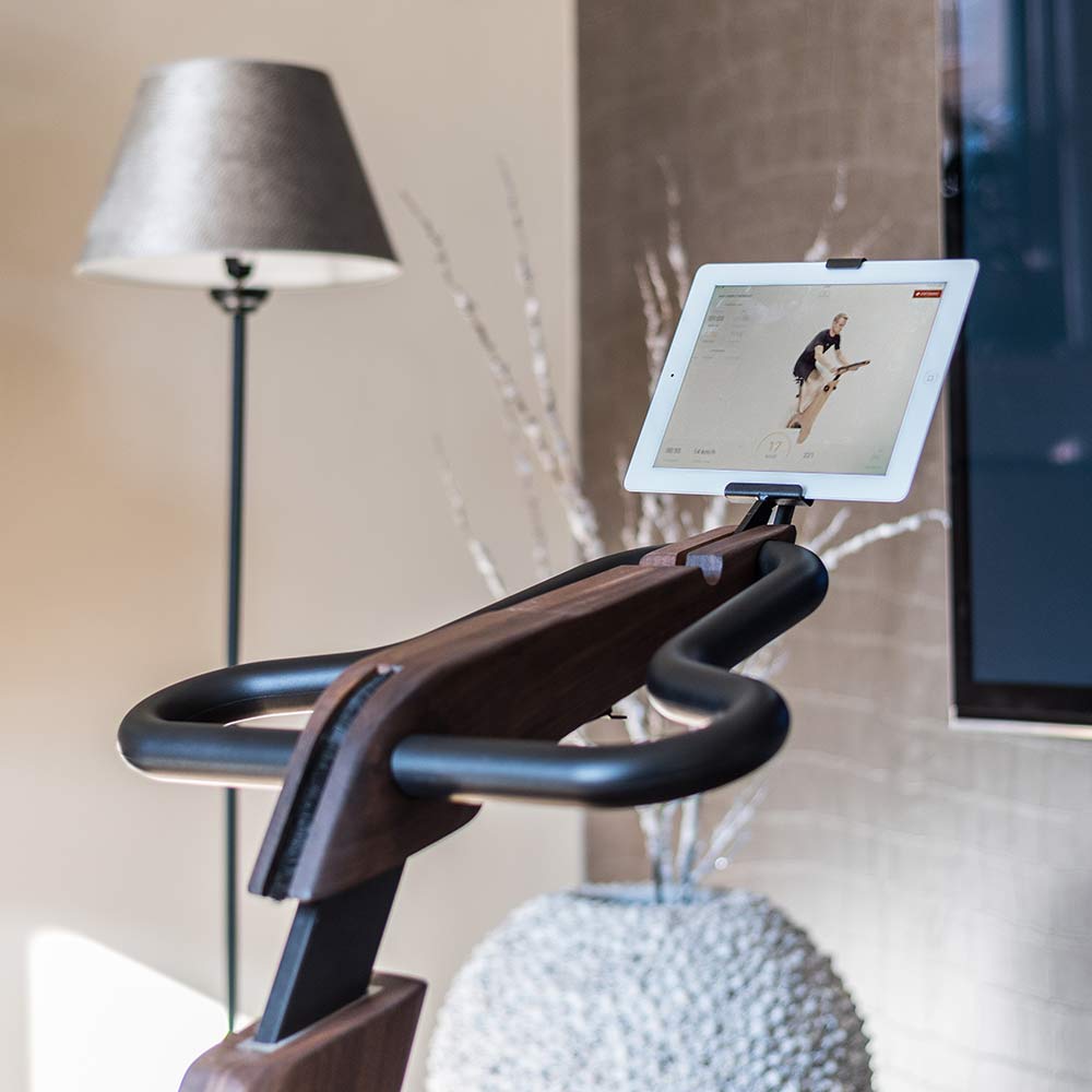 - Guidon multiprises, réglage de la hauteur, équipé d’un support smartphone ou tablette. Il se retourne et transforme le NOHrD Bike en espace de travail.